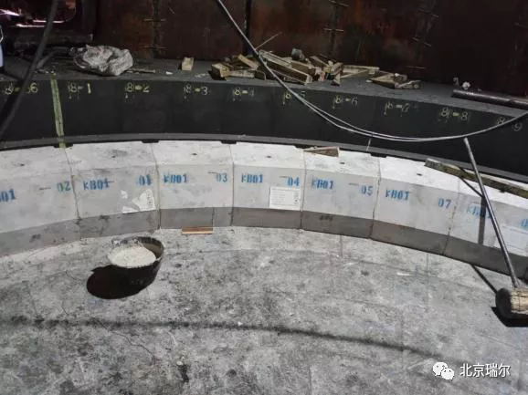 爐缸設(shè)計(jì)10層環(huán)形炭磚、4層陶瓷杯壁磚,陶瓷杯壁磚總高度3188mm.陶瓷杯壁磚采用燕尾槽結(jié)構(gòu),沒有冷熱面直接貫穿磚縫,陶瓷杯壁與環(huán)形炭磚之間采用剛玉澆注料整體澆注,通過燕尾槽將澆注體和陶瓷杯壁形成穩(wěn)定的整體,有效地增強(qiáng)了陶瓷杯壁的結(jié)構(gòu)穩(wěn)定性,并有效地防止堿金屬、鋅等金屬對(duì)炭磚的侵蝕。